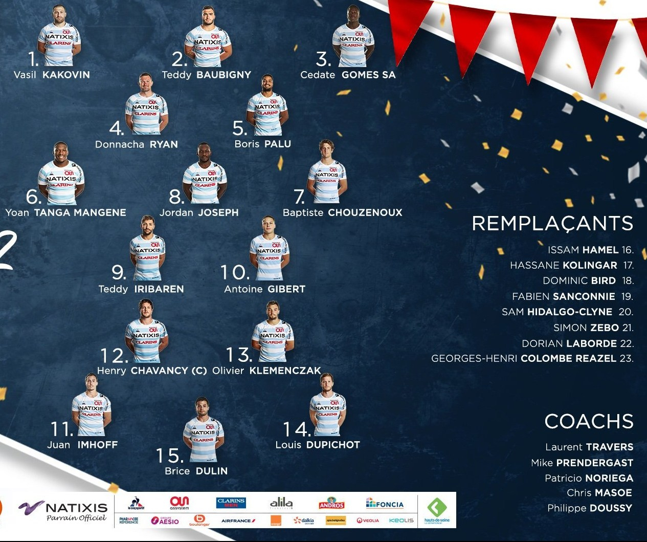 C’est la paire Iribaren-Gibert qui animera l’attaque des Ciel-Et-Blanc tandis que Brice Dulin a été préféré à Simon Zebo à l’arrière. A noter également la première titularisation de Yoann Tanga Mangene qui sera la seule recrue alignée au début du match (Sam Hidalgo-Clyne, et Dorian Laborde prenant place sur le banc). A noter les absences entre autres d’Eddy Ben Arous, Kevin Le Guen, Teddy Thomas ou Antonie Claassen.