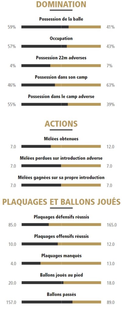 Niveau déception, Teddy Iribaren a soufflé le chaud et le froid, tout aussi bien inspiré au ras des regroupements que maheureux dans certains de ses choix choix. On retiendra également son taux de réussite anormalement faible qui coûte cher au final (3 échecs). Son compère de la charnière Joaquin Diaz Bonilla n’a pas non plus briller: sensé apporter son expérience avec sa riche saison dernière avec les Jaguares, il n’a pas pesé dans les débats, plongeant en même temps que ses coéquipiers en 2ème mi-temps.