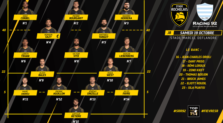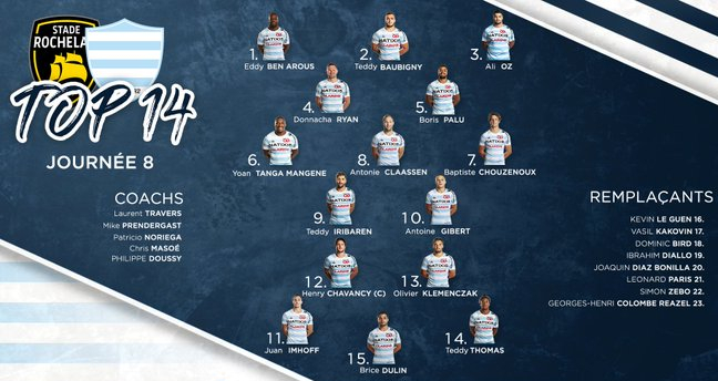 Une équipe expérimentée qui se connaît bien. Voilà comment résumer la composition des Rochellais pour ce match avec la présence de nombreux joueurs internationaux et/ou rompus aux joutes du Top 14 (Vito, Sinzelle, Bougarit, Aguillon…). On notera la présence de 2 anciens Racingmen avec Marc Andreu et Arthur Retière ainsi que la présence de Brock James, Jean Charles Orioli ou Dany Priso sur le banc.