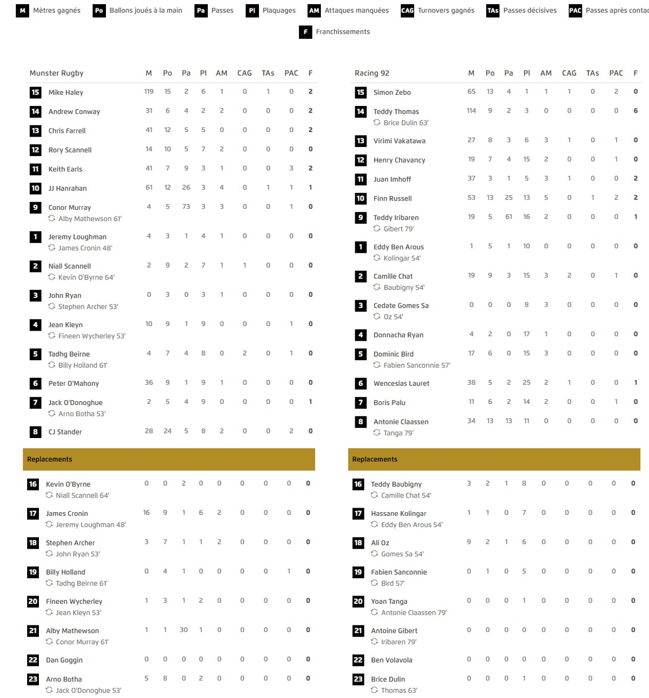 Enfin, si le pack dans son ensemble aura été performant, l’impact mis par Dominic Bird et Donnacha Ryan aura été précieux notamment en défense. Dans ce domaine, mention spéciale à Wenceslas Lauret et ses 25 plaquages, meilleur total du match.