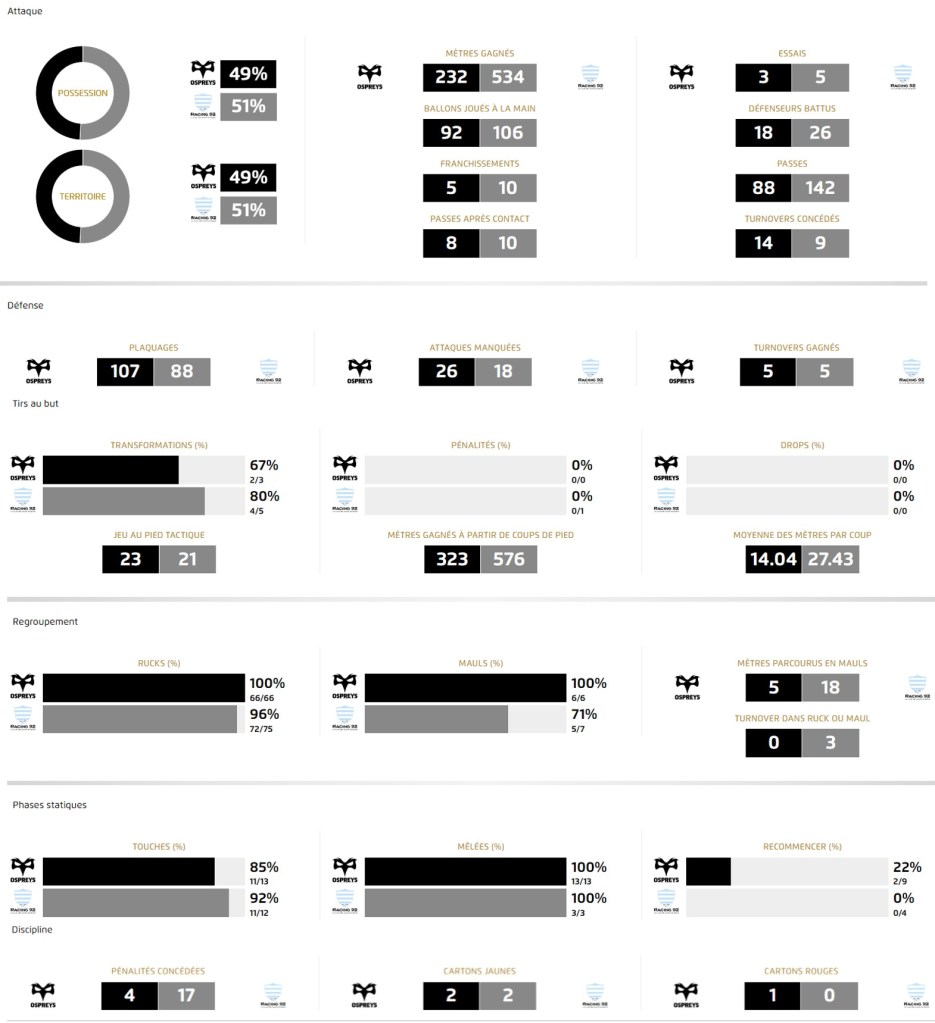 Pas grand chose à ressortir de cette rencontre certes marquée par de nombreux essais (8 au total) mais tronquée par une indiscipline constante –17 pénalités contre les Racingmen – qui aura même vu les Ospreys évoluer à 12 en première période.