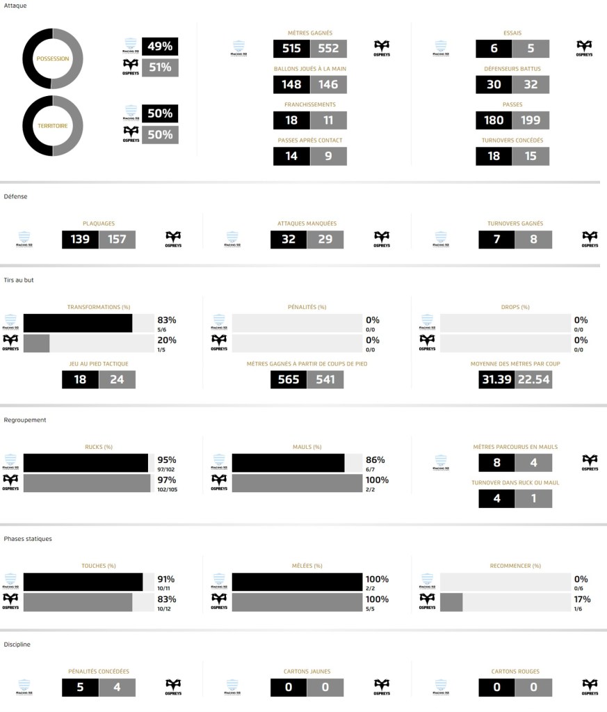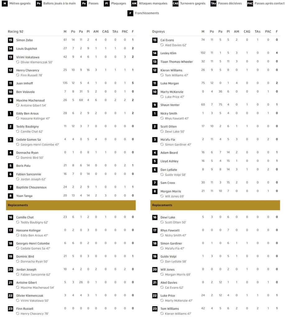On n’oubliera pas non plus que si le bonus a été acquis en 39 minutes par les Racingmen, c’est grâce aux cadeaux de McKenzie– l’ouvreur des Ospreys – qui a offert à Louis Dupichot d’abord (10′) puis Juan Imhoff (14′) l’occasion de briller.