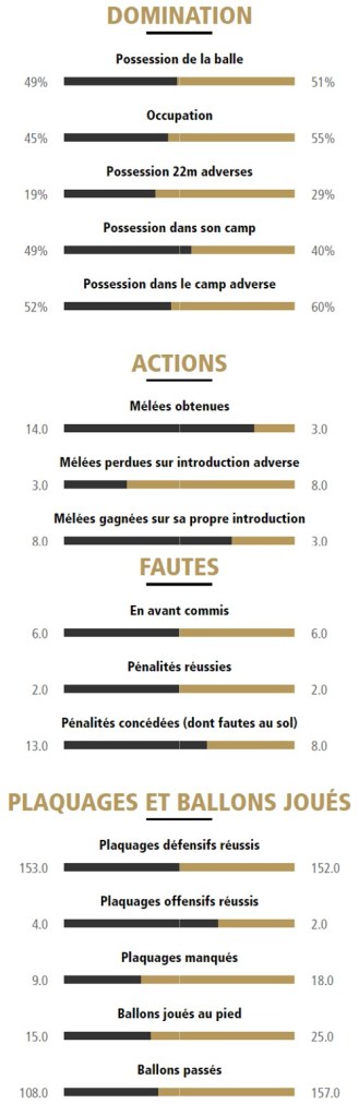 Malgré une réaction d’orgueil des locaux (essai Johnston 53′), les Ciels et Blancs annihilèrent les tentatives Brivistes avec une défense aussi disciplinée qu’agressive avant d’enfoncer le clou par Teddy Thomas (59′) puis Brice Dulin (71′) pour assurer le bonus offensif.