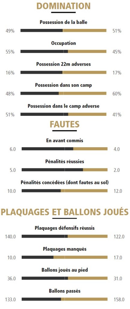 Dans leur antre inviolable du Matmut Stadium, les lyonnais ont tout simplement étouffés nos ciels et blancs grâce à une défense intraitable (93% de plaquages réussis). Malgré une première période réussie, la troupe d’Henry Chavancy aura beaucoup trop souffert aux moments clés du match en encaissant des points juste avant et après la mi-temps, à l’heure de jeu et en fin de partie.