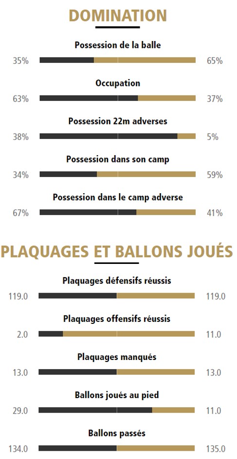 Intraitables en défense – 4 pénalités concédées seulement – les Ciels et Blancs ont tué dans l’œuf toutes les tentatives de Jaunards qui n’ont jamais su trouver la clé et ont cafouillé les rares miettes que leur ont laissé Finn Russell et consorts. Pire encore, ils se sont sabordés en se faisant interceptés à deux reprises et en offrant l’avant-dernier essai à Maxime Machenaud sous les poteaux.